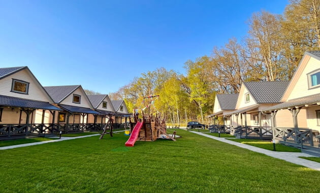 Nasze komfortowe domki letniskowe zostały wybudowane w 2023 roku. Posiadają parter oraz użytkowe poddasze. Teren naszego ośrodka jest ogrodzony oraz monitorowany całą dobę dla zapewnienia bezpieczeństwa mieszkańców.